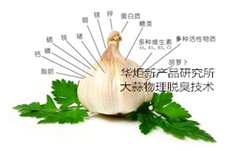 华炬新产品研究所农业技术事业部科技人员经多年研究认为:大蒜中的大蒜氨酸是无臭味的,它和大蒜苷酶存在于不同部位,彼此不接触,但当切碎、捣烂时,其细胞被破坏,其中大蒜苷酶活化,两者接触,才将大蒜氨酸分解成大蒜素和含烯丙基硫化物,它很不稳定,适宜条件下分解生成臭蛋白,散发出强烈的大蒜臭味,令人生厌。目前大蒜脱臭一般采用的是加热除臭法、浸泡除臭法、调制除臭法、包裹除臭法、冷水除臭法、食用油除臭法等,华炬新产品研究所农业技术事业部开发研究的一种物理法大蒜除臭技术能快速去掉大蒜的恶臭,不破坏和不损失大蒜的有效成分,且方法简单,成本低廉,不产生异味,并保持住它的多种营养成分,华炬大蒜物理脱臭技术方法简单、容易操作、成本及投入低而产成品的附加值高,是一种全新的大蒜加工技术方法,华炬新产品研究所现转让该华炬大蒜物理脱臭技术方法并提供相应技术服务。