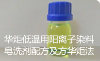 华炬科技新产品研究所技术咨询委员会科研人员现推荐一项一种低温用阳离子染料用皂洗剂配方及方法,该技术低温皂洗剂中含有马丙共聚物,马丙共聚物能与染料结合并防止沾色,洗下来的浮色能够被马丙共聚物分散在水中,不再沾到织物上,具有优良的皂洗性能,同时还具有阻垢作用;本发明低温皂洗剂中添加了乙二胺二邻羟苯基大乙酸钠,具有优良的螯合能力,防止染料与钙镁离子结合沉积在织物上,具有良好的抗硬水性能,该技术在皂洗剂中加入了一种含聚氧乙烯醚链季铵盐阳离子表面活性剂,该表面活性剂与洗脱下来的阴离子染料发生作用,并均匀的分散在皂洗液中,大大降低甚至防止了浮色反沾纤维的能力,因而具有很好的保护白地、防止浮色反沾纤维,提高纤维色泽鲜艳度的效果。现将该一种低温用阳离子染料用皂洗剂配方及方法及技术方案及实施例介绍如下供研究交流参考:(711421 451515)