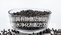 华炬新产品研究所技术咨询委员会科研人员现推荐一项一种具有除铬功能的饮用水净化剂配方及方法,该技术具有以下优点:腐植酸与活性炭性状类似,混合均匀,克服了常规净水剂不易混合均匀的缺点,并且使用效果优良,天然无毒,无味,物理化学性质优良,可用于饮水深度处理或突发性水污染事件导致的饮用水应急预处理,对环境友好,无污染。腐植酸具有多羧基、酚羟基,易与金属离子形成螯合物,快速吸附水中的重金属离子;活性炭又具有多孔,比表面积大,吸附能力强等优点,不仅可以吸附水中杂质,又可吸附一定量的重金属离子;二者在自然界中储量大,价格低,生产成本低,流程短,操作简便,适合工业化生产,现将该一种具有除铬功能的饮用水净化剂配方及方法及技术方案及实施例介绍如下供研究交流参考:(541211 231587)