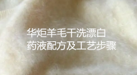 华炬科技新产品研究所技术咨询委员会科研人员现推荐一项一种羊毛干洗漂白药液配方及工艺步骤,使用该技术的药液均匀喷洒在羊毛上,可以实现羊毛的干洗漂白,取消了洗毛生产环节,实现了羊毛干洗与漂白的同步进行,因此节约了大量时间和能源消耗,大大提高了生产效率,降低了生产成本;其用水量极少,不产生污水,节省了水资源,从根本上杜绝了对环境的污染,现将该一种羊毛干洗漂白药液配方及工艺步骤及技术方案及实施例介绍如下供研究交流参考:(311271 221465)